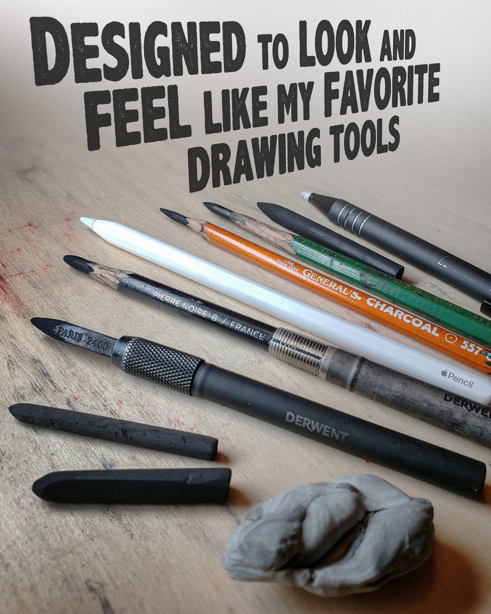 The set includes a range of charcoal pencils, vine, willow, conté, charcoal dust, and compressed charcoal sticks. Also, special smudge and eraser tools for very natural effects.